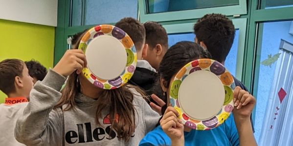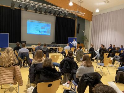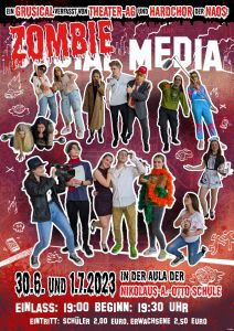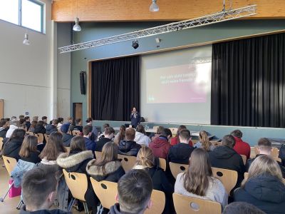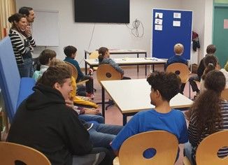 Gezeigt wurde das Theaterstück „Monster Moments“, das in lustigen Episoden vom Leben eines Teenagers in der Pubertät berichtete. Natürlich alles auf Englisch. Es gab viele positive Stimmen. Die Schülerinnen und Schüler konnten nach der Vorstellung noch interessierte Fragen an die beiden professionellen Schauspieler aus London stellen, die das Stück vorgeführt hatten. Die Fragerunde kam besonders gut an und es wurden tolle Fragen auf Englisch gestellt. Wir freuen uns, dass die Veranstaltung nach einer langen Pandemie-Pause wieder an unserer Schule stattfinden konnte.