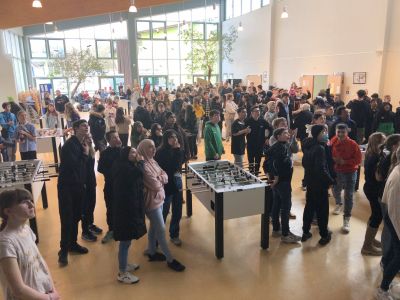 Die Firma „Kicker Profis“ hat in der Aula der NAOS 16 Kickertische aufgebaut, an denen sich die Schüler und Schülerinnen mit viel Spaß sportlich messen konnten. Am Nachmittag konnten sich auch die Lehrerinnen und Lehrer der NAOS an den Kickern austoben.