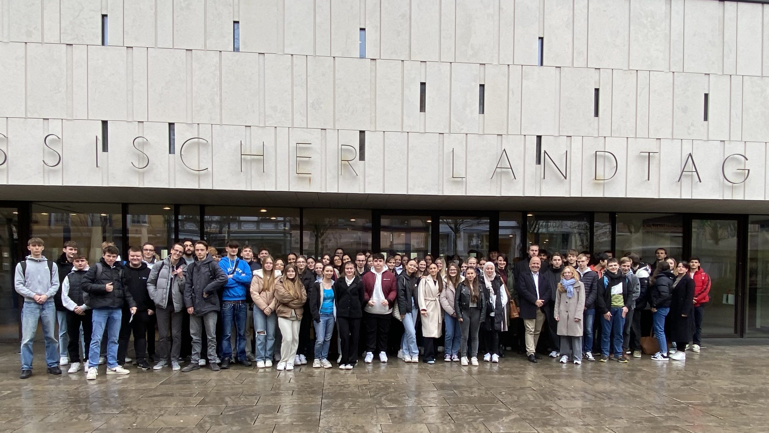 Politik live erlebten die vier Klassen der E-Phase bei einem Besuch im Landtag. Dabei wurden sie von ihren PoWi-Lehrkräften begleitet. Die Einladung ausgesprochen hatte Herr Schon, der direkt gewählte Abgeordnete des heimischen Wahlkreises.