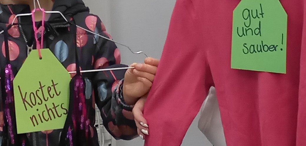 Im Wahlunterricht 9G „Mode-Design-Umwelt“ 2022/23 haben Schüler und Schülerinnen die Werbeobjekte dazu gestaltet und Plakate erstellt. Der Kleidershop findet an einigen Tagen pro Schuljahr statt. Der Förderverein unserer Schule unterstützt das Projekt für notwendige Anschaffungen – dafür vielen Dank! Wer beim Auf- bzw. Abbau mithelfen oder Kleidung für Kinder und Jugendliche spenden möchte, ist herzlich willkommen!