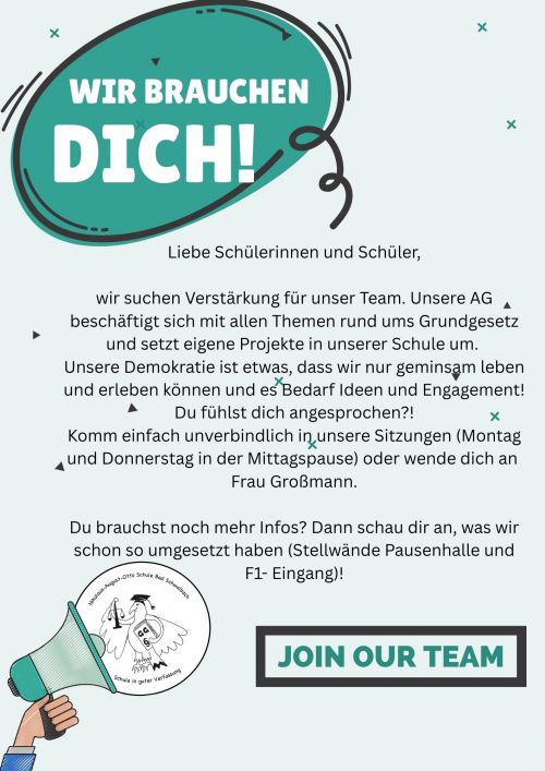 Das Grundgesetz wird im Arbeitskreis „Schule in guter Verfassung“ in den Mittelpunkt gestellt. Anspruch und Wirklichkeit werden jedes Jahr an einem neuen Artikel betrachtet und ihre gesellschaftliche, geschichtliche und politische Bedeutung deutlich gemacht. Die Auseinandersetzung mit den Artikeln findet dynamisch im Fachunterricht, in Arbeitsgemeinschaften, gemeinsam mit externen Kooperationspartnern und an außerschulischen Lernorten statt.