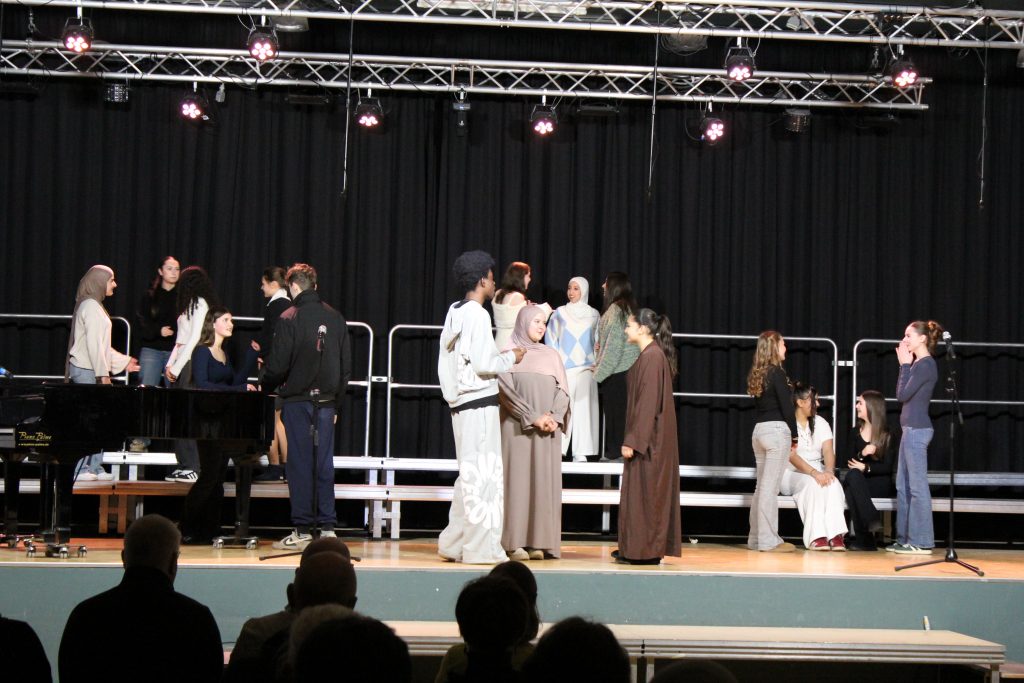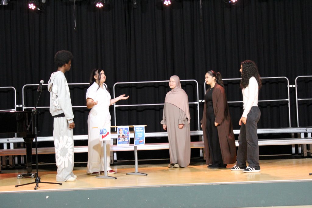 Den kulturellen Abschluss unseres „Deeper Learning Projekts“ zu den Grund-und Menschenrechten der 9. Realschulklassen bildeten zweiTheateraufführungen in der Aula. Insgesamt 16 Schülerinnen und Schüler der 9R Klassen und ein Schüler aus der 8R standen am 05. und 11. Februar auf der Bühne. Die Wiesbadener Theaterpädagogin Leila Haas entwickelte zwei Wochen lang mit den Jugendlichen ein Stück, indem insbesondere die Gleichberechtigung zwischen den Geschlechtern sowie Migrations – und Diskriminierungserfahrungen ihrer eigenen Lebenswelt den inhaltlichen Schwerpunkt bildeten. Die Jugendlichen entwickelten das Drehbuch selbst undheraus kam ein Stück, in dem auf verschiedensten Sprachen gespielt und auchviel gesungen wurde. Das Publikum war bei beiden Aufführungen sehr still, erlebten sie doch Ihre Mitschülerinnen oder Schüler erstmals in einer anderenRolle, wenn sie z.T. auch ihre Fluchterlebnisse als Kinder schilderten. Um so lauter wurden die Schülerinnen und Schüler nach ihrem Stück gefeiert. Möglich gemacht wurde dieses Projekt auch durch das Bundesförderprogramm „Demokratie Leben“ des Rheingau-Taunus-Kreises.